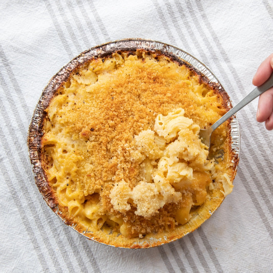 (FROZEN) Our famous homemade mac & cheese! Giant elbow macaroni, white cheddar, cream cheese, and Velveeta topped with panko breadcrumbs.